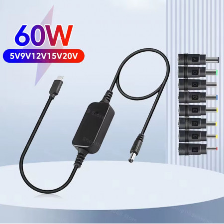 Універсальний кабель із DC 5.5x2.1mm 5V/9V/12V/15V/20V . Його можна використовувати для живлення від зарядного пристрою з підтримкою Power Delivery (PD). Наприклад, при відключенні електрики запитати роутер від повербанку і продовжувати користуватися інтернетом (якщо провайдер продовжує подавати інтернет кабелем до роутера).